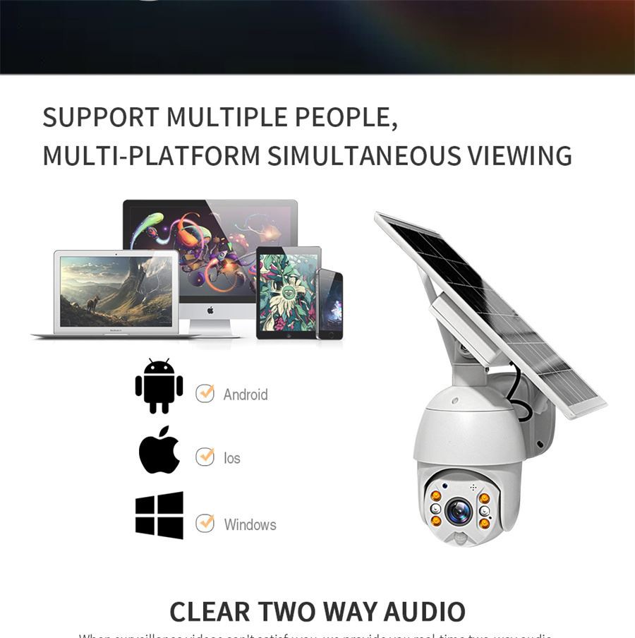 See IP66 suurepärase ilmastikukindla jõudlusega päikeseenergia koduvalvekaamera, see juhtmevaba wifi päikesekaamera takistab vee imbumist kaamerasse ja talub temperatuurivahemikku -20 °C kuni 50 °C, mis suudab taluda ka raskemaid ja äärmuslikke tingimusi, nagu tuul, vihm, lumi. Andke oma kodule pidev ööpäevaringne videovalve